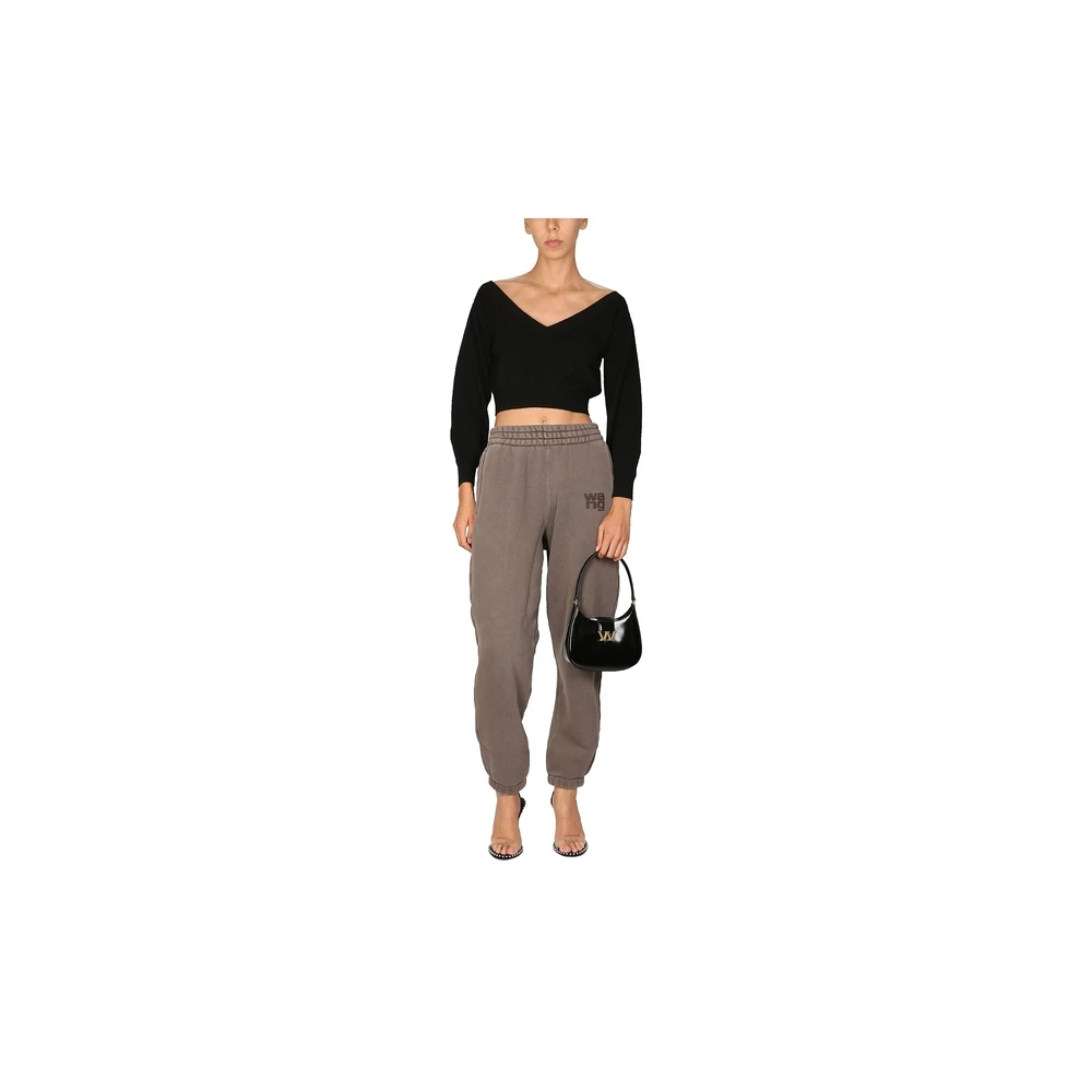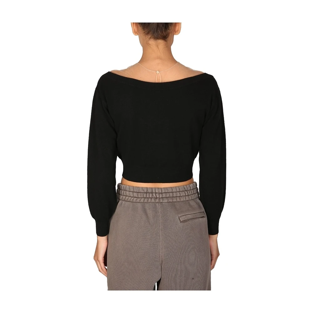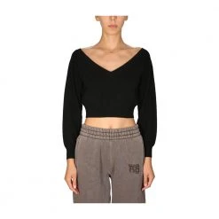 V-hals med illusjonstylinnsats, ribbet krage, mansjetter og bunn, beskåret, modellen er 180 cm høy og har størrelse.