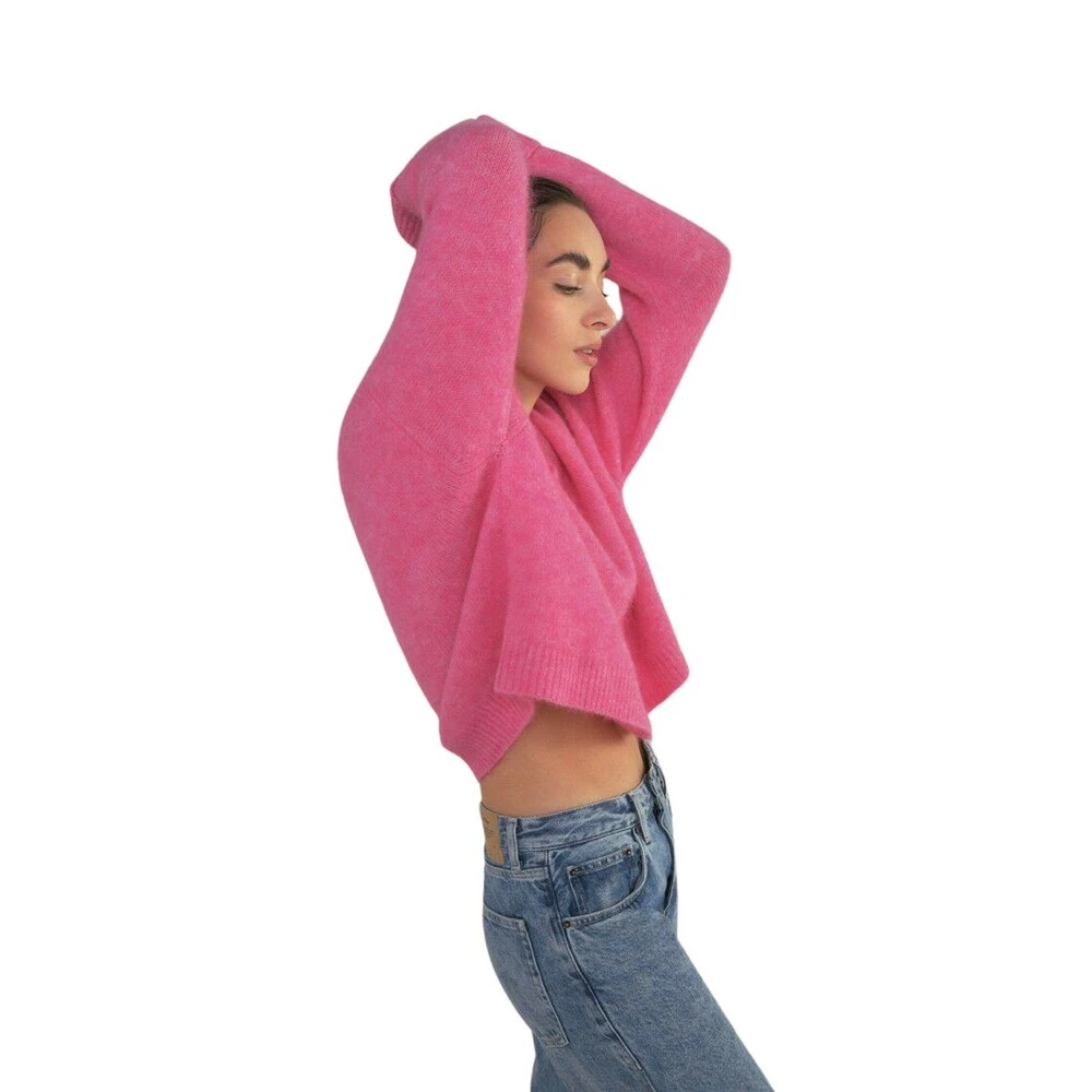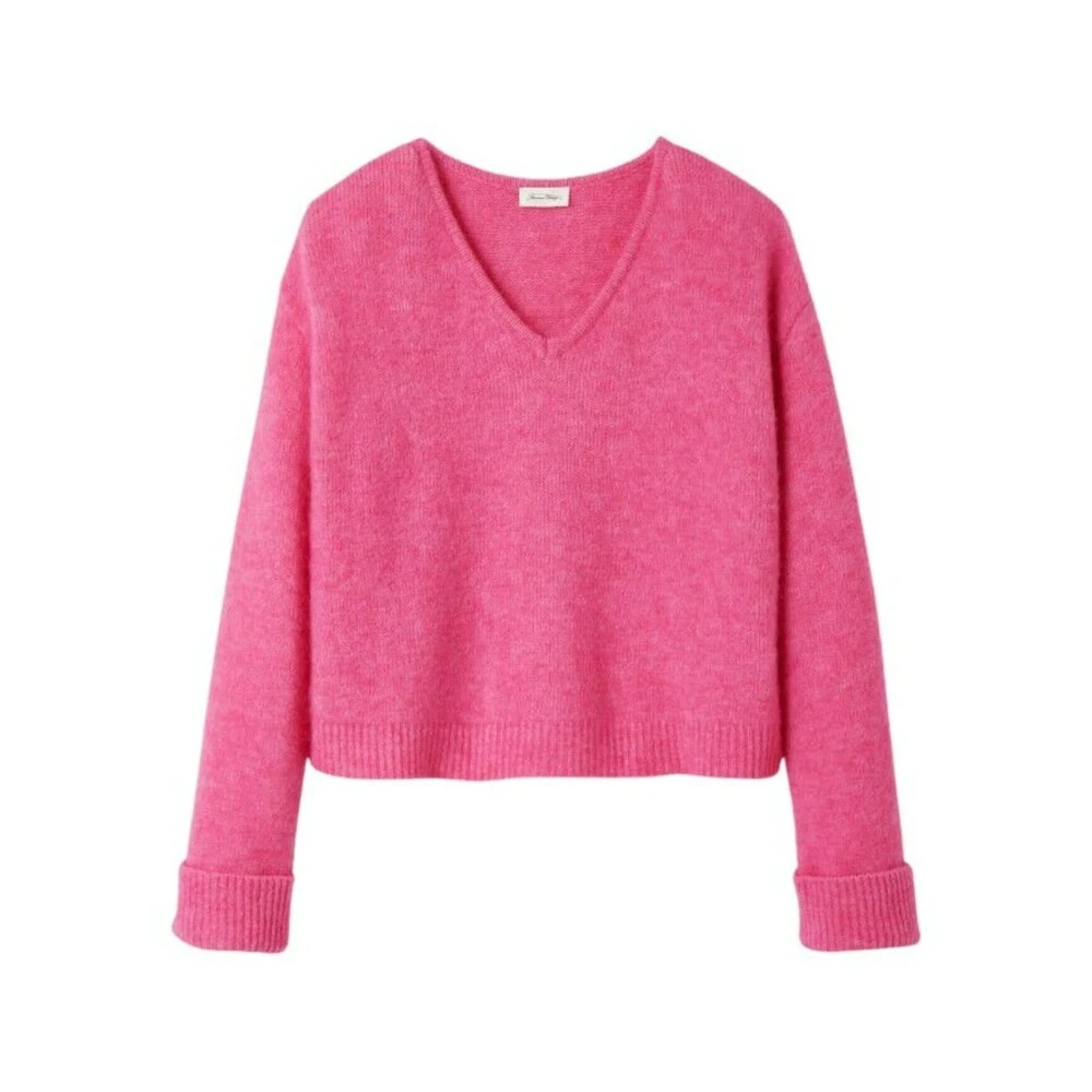Genser med V-hals som er super behagelig Ä ha pÄ. Fargen heter bubble gum shine er en nydelig rosafarge. Litt vid, lett og ledig i fasongen med linning nede. Perfekt til en jeans eller over en kjole.