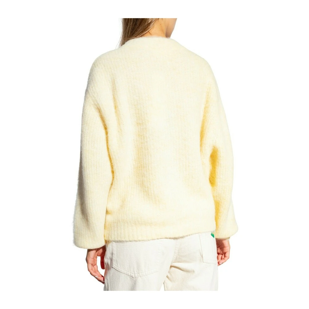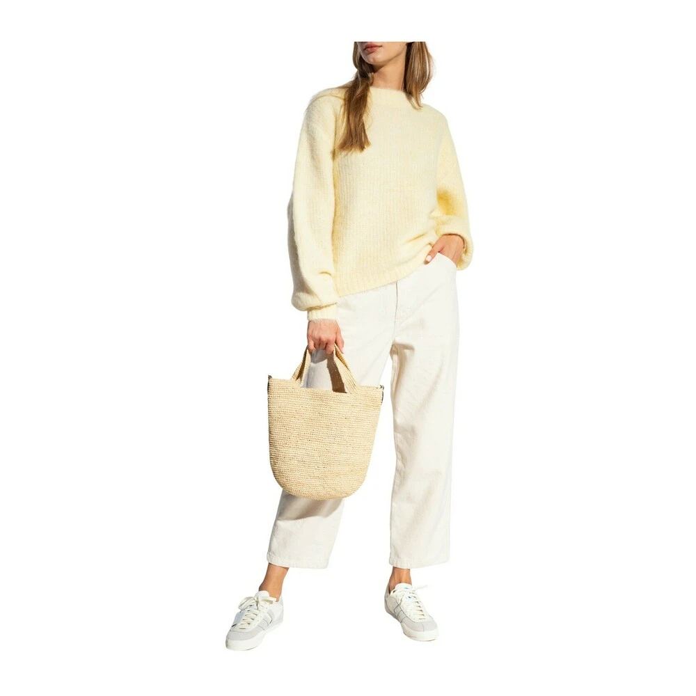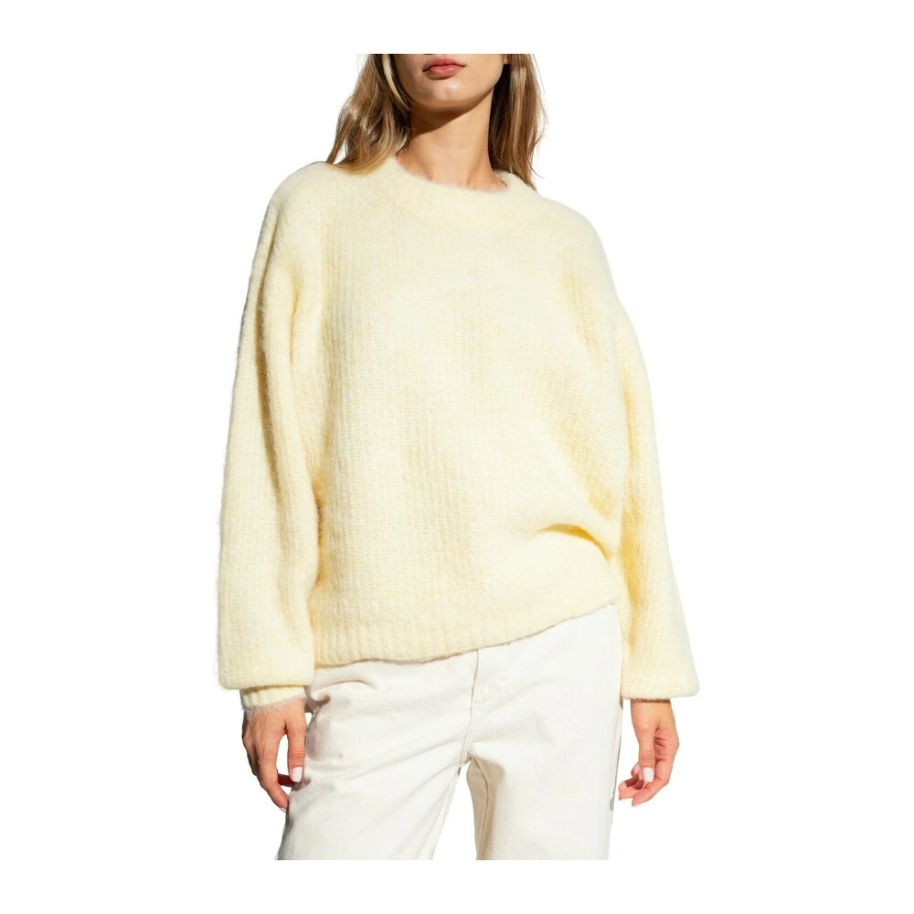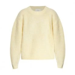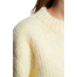 Lysegul lÞs passende genser fra amerikansk Ärgang. Dette plagget er laget delvis av alpakkaull, og har en ribbet rund hals, hem og mansjetter.