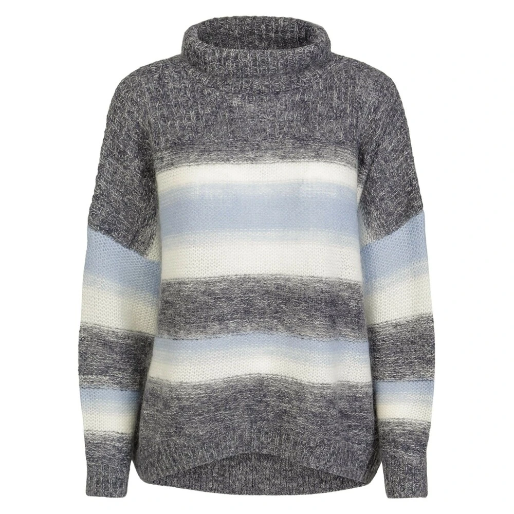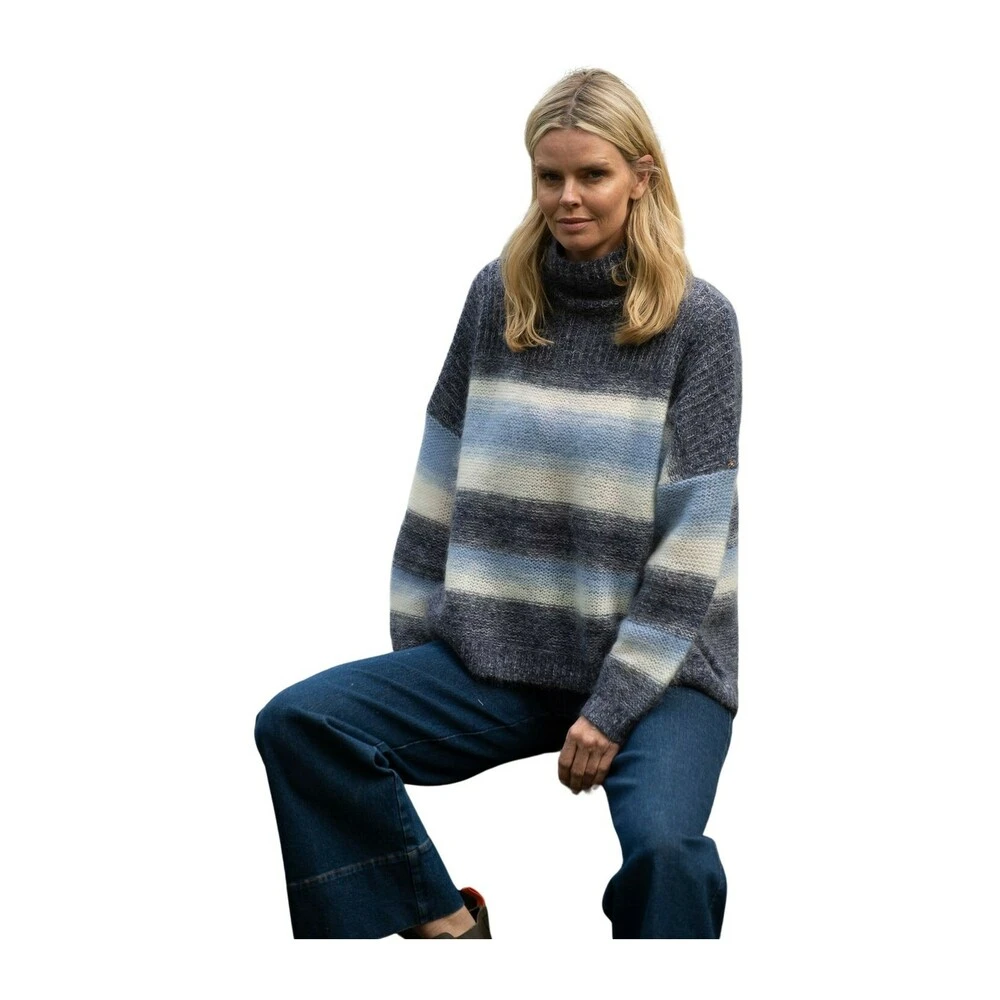 Navn: Arnie Says Lilou Winter Farge : Blå/ Navy Combo Beskrivelse : Nydelige genser med boxy passorm, lange ermer og høy løs hals. Dette er en bestselger, i en herlig fargekombinajson. Materiale : 61% Mohair, 33% Akryl, 6% Nylon