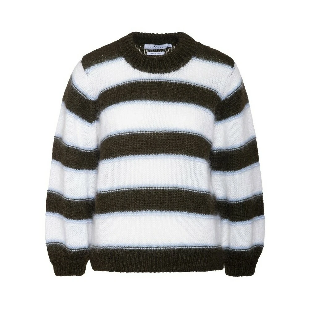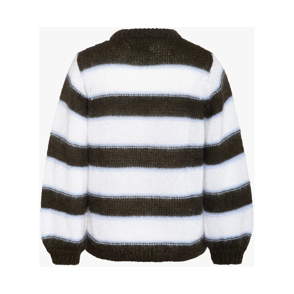 Arnie Says – Melrose Stripe Genser i en leken fargesjattering. Rett i fasongen, rund hals og full lengde pĂĄ ermene. Normal til stor pĂĄ størrelsen. Modellen har ribbestrikket kanting pĂĄ hem, ermer og hals. 50% Mohair 50% Polyamid
