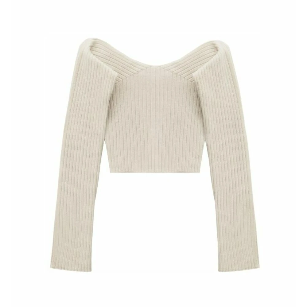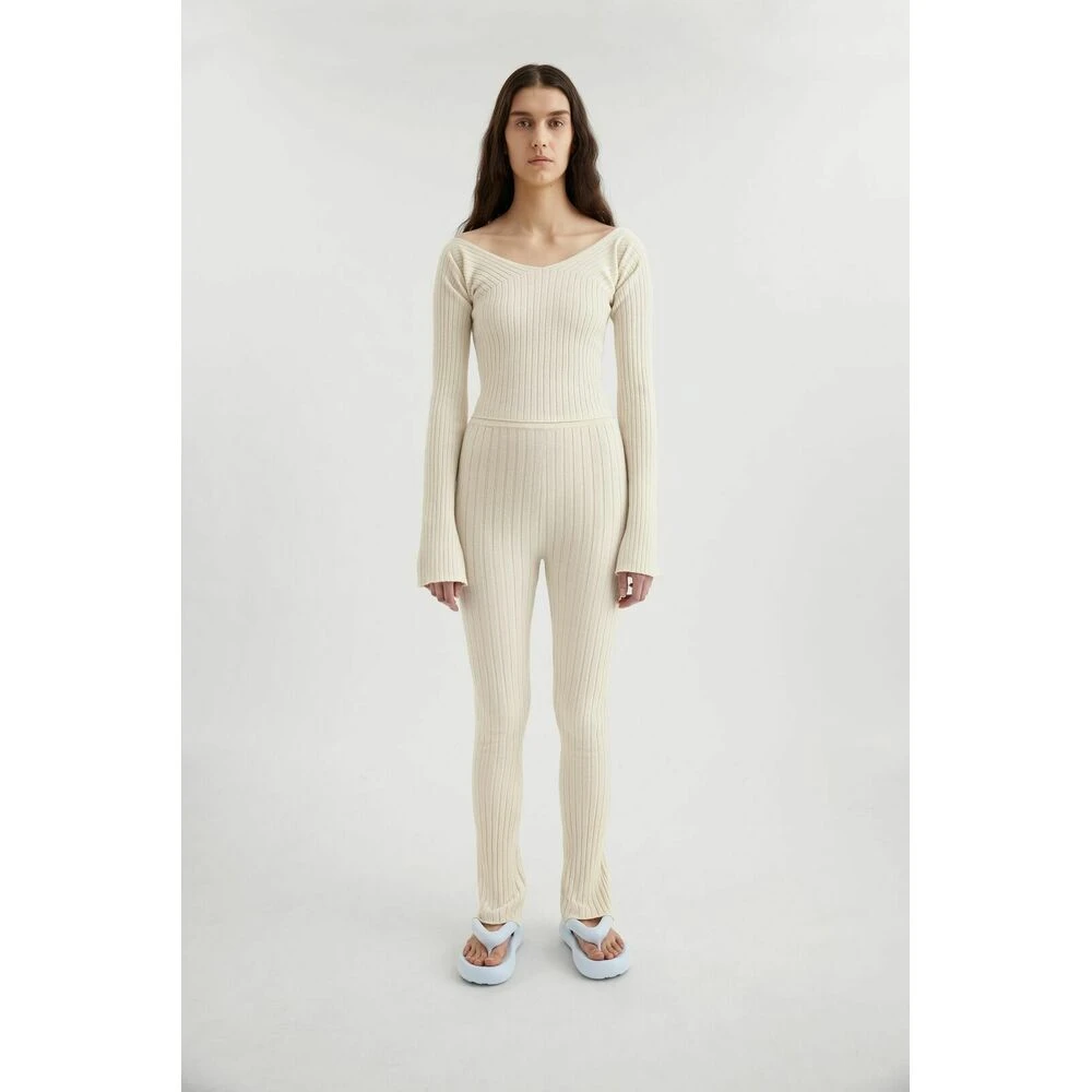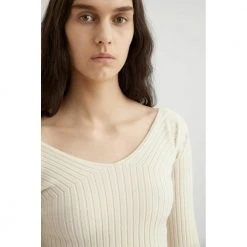 Tune Rib Crop Top har en feminin silhuett laget ved hjelp av en spesiell konstruksjon, som utvider Bodyen til ermet rÞr. Toppen er laget av et ullblandingsmateriale med detaljer om et tonalt broderi pÄ mansjetten. Eugenia er 179 cm og har pÄ seg stÞrrelse S.