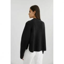 Wise-genseren er ribbestrikket av varm lammeull. Den er designet med raglan-ermer og splitter i falden for Ä sikre at den sitter komfortabelt og legger seg enkelt. SikkerhetsnÄlen A kan tas av og plasseres andre steder. Laura er 180 cm og har pÄ seg stÞrrelse S.