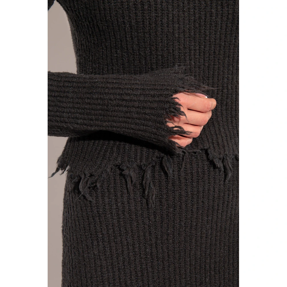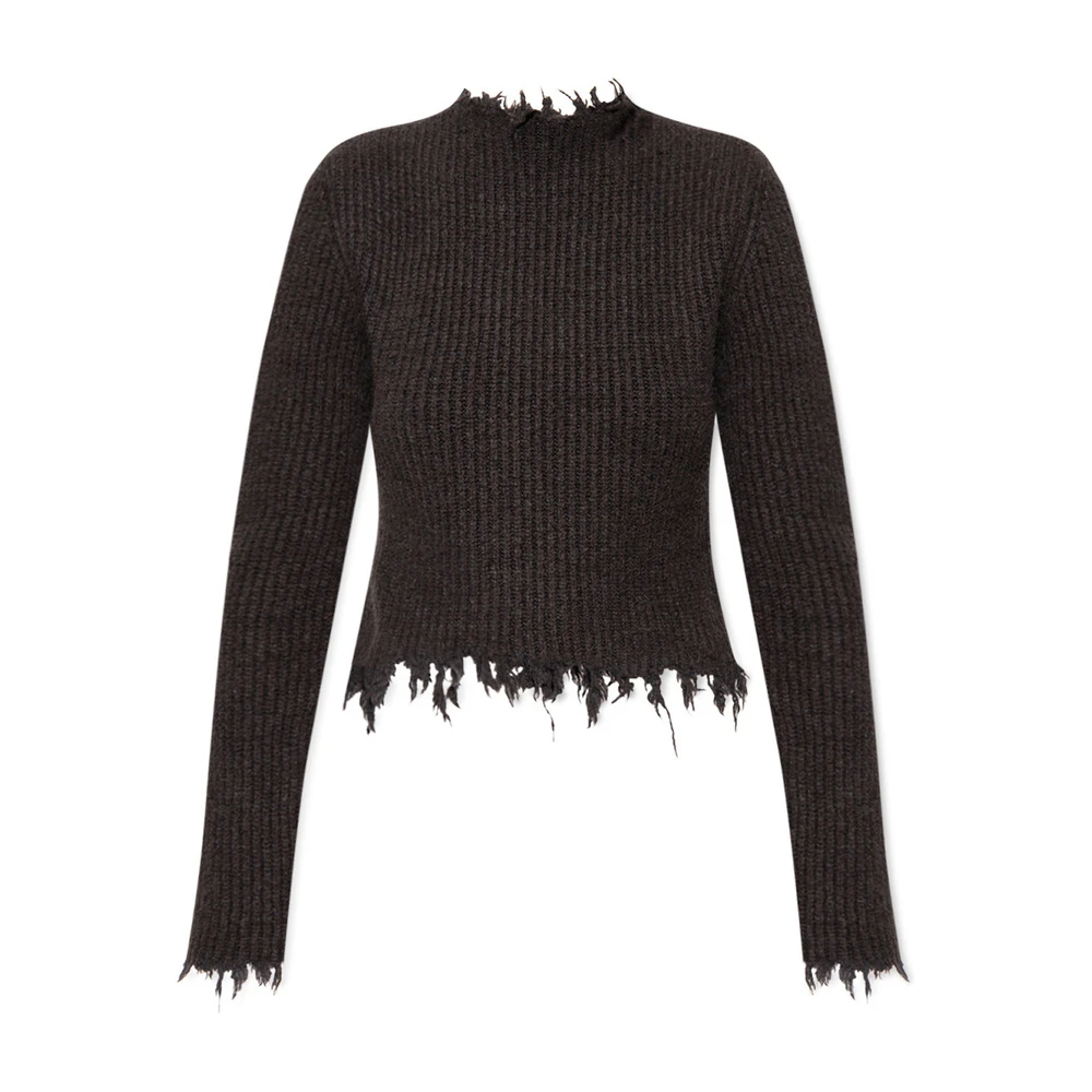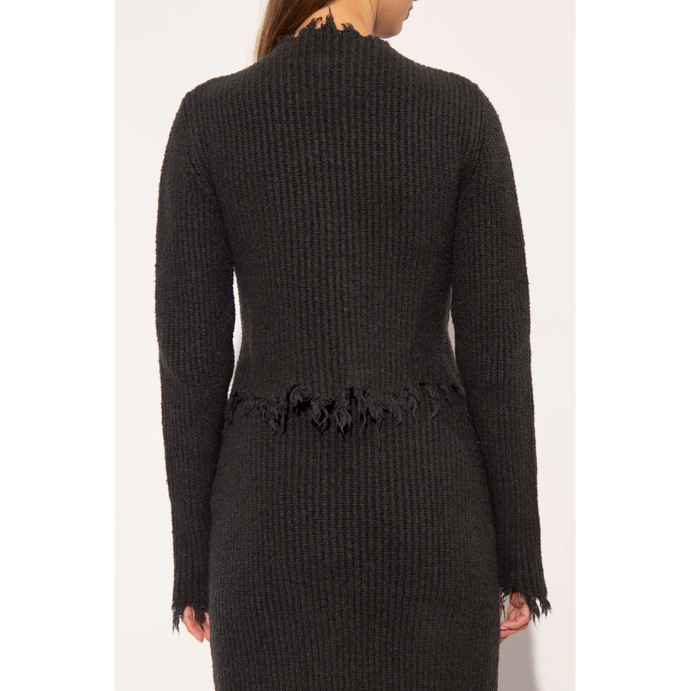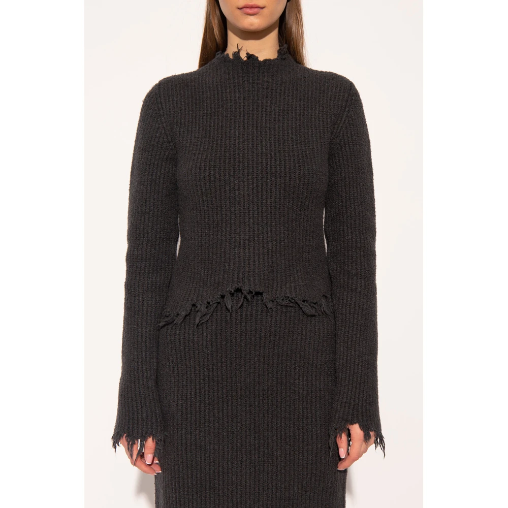 MÞrkegrÄ genser fra Balenciaga. Denne stilen er laget av en bomulls- og ullblanding, og har en stÄende krage, lange ermer og rÄ trimmer.