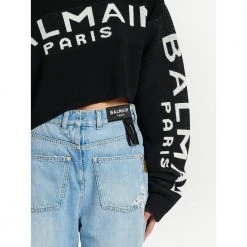 Balmain Top Black/White Wool-Blend Logo-Print Off-Shoulder Jumper fra Balmain med asymmetrisk design, all-over logo-trykk, strikket konstruksjon, off-shoulder, lange ermer og beskåret.