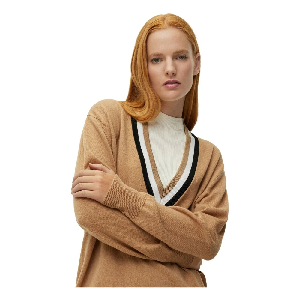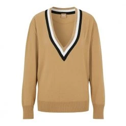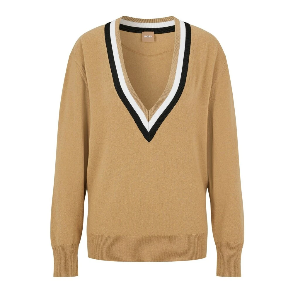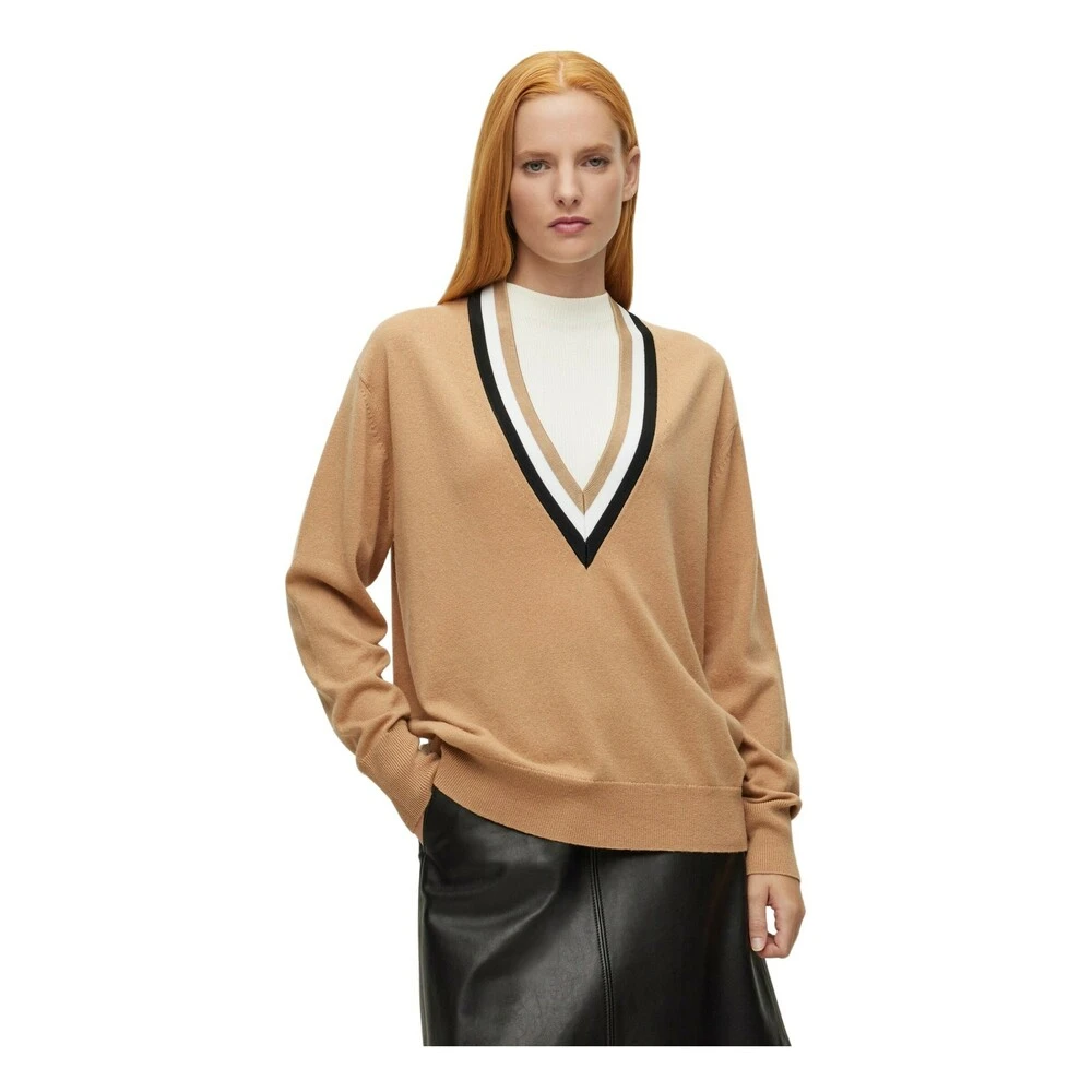 Herlig pullover i 90% ull og 10% Kaschmir. Dyp V- hals med stripe i sort og offwhite. Kvalitet på halskant 90% viscose ,9%polyamid og 1% elastan. Vask: Anbefalt håndvask.