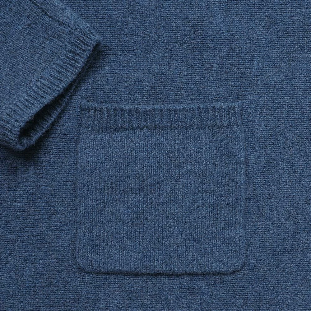 Milk er en tynn strikket genser fra Mansted i blå m/lomme nederst på siden. Laget av 100% lammeull.