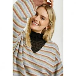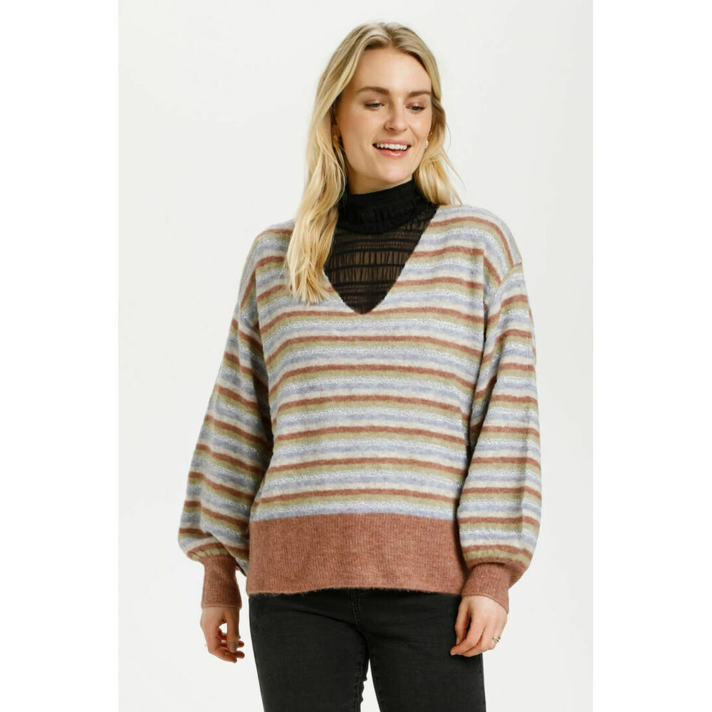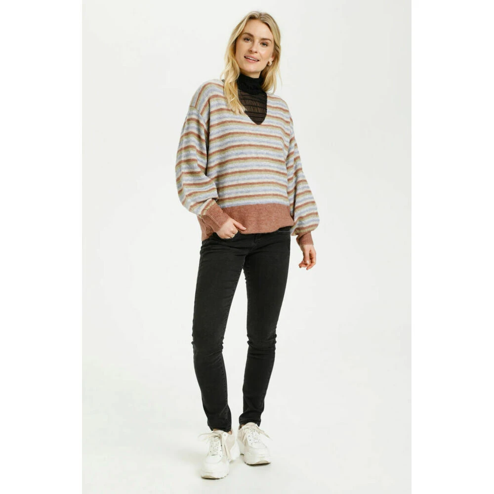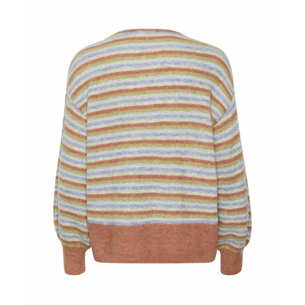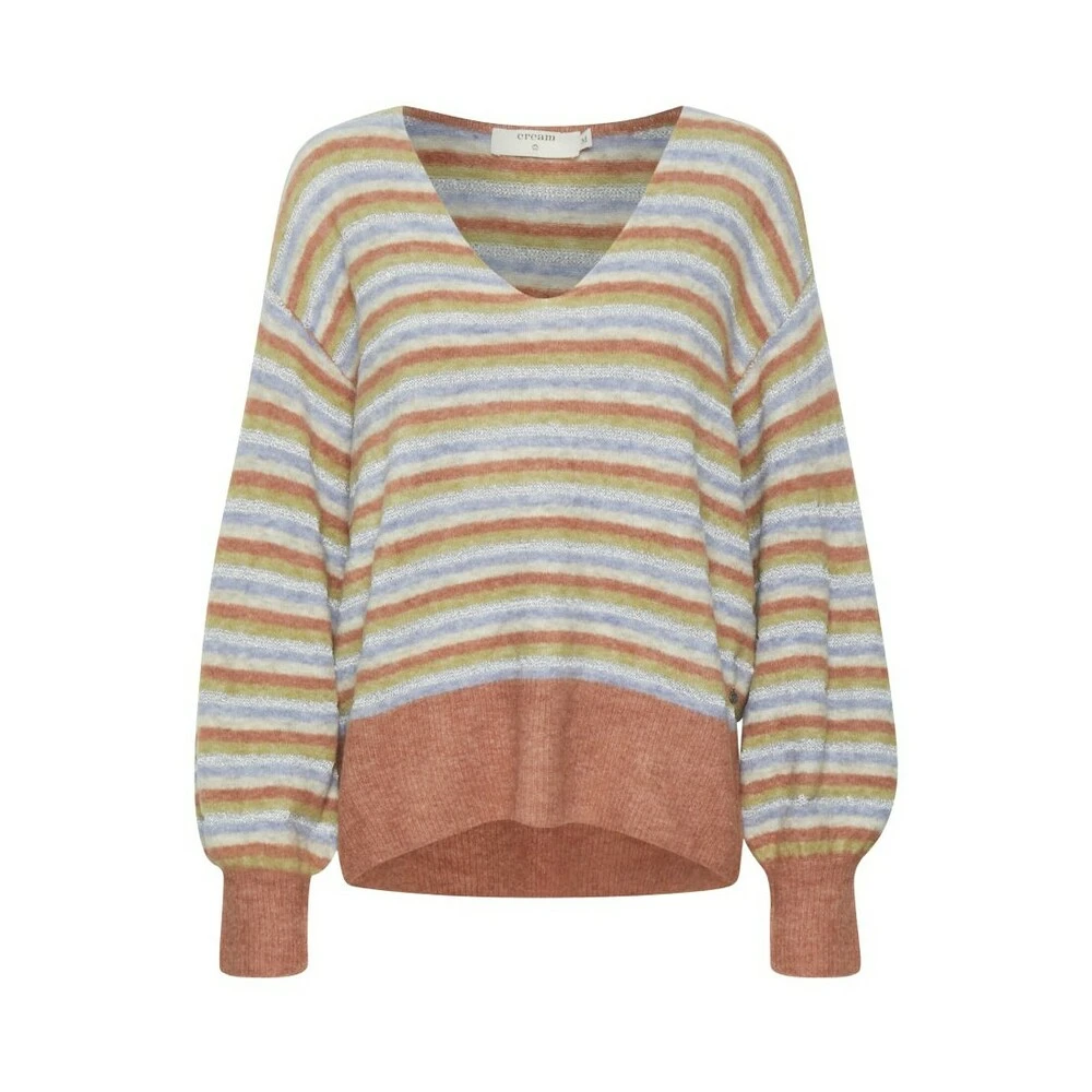 Nydelig strikket genser med V-hals fra Cream med V -hals og striper i fargene krem, lys Blå, Lys Grønn Sølv og Lys Cognac. Lengde i st. M: ca. 61 cm.