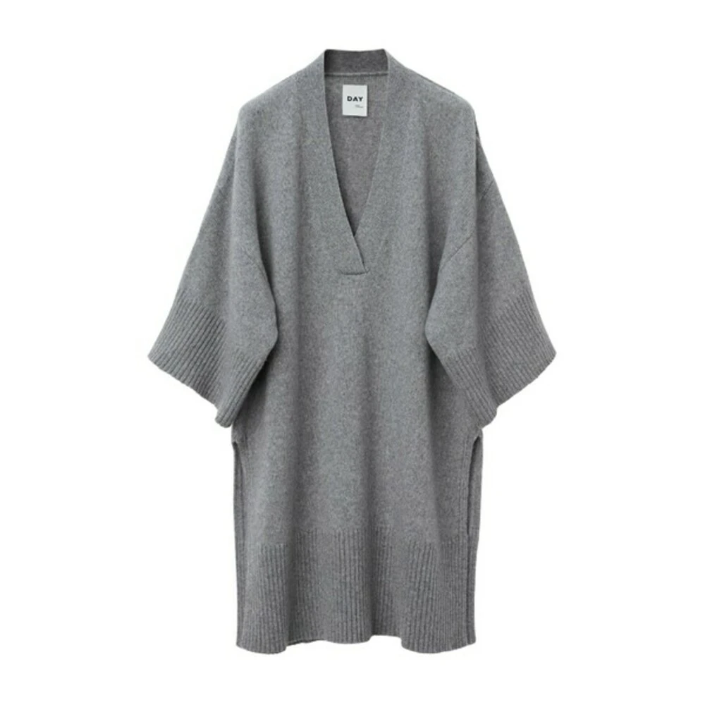 An oversized, soft knit with a V-neck and ribbing at the hem, sleeves, and neck. The pullover features a dipped hem and slits at the sides. Wear over flared leggings for a casual, elegant look.