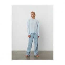 Nydelig lyseblå genser med rund hals og oversized fasong. Supermyk og strikket design. Brede vrangborder nederst og ved ermene. Søm i ryggen som avsluttes med en splitt bak. Pagget er noe lengre bak enn foran.