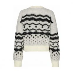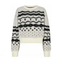 Verona Winter Knit fra Designers Remix. Cozy og kul strikkegenser fra Designers Remix – en ny og moderne vri pĂ„ den klassiske, mĂžnstrete strikkegenseren. Verona Winter Knit har lange ermer med ribbestrikkede mansjetter, og avslappet, lav skuldersĂžm. Genseren har cropped lengde med ribbestrikket fald og sort mĂžnster pĂ„ hvit bakgrunn. Style genseren med et midiskjĂžrt i sateng, eller et par skinnbukser. Materiale: 35% polyamid, 33% alpakka, 32% ull