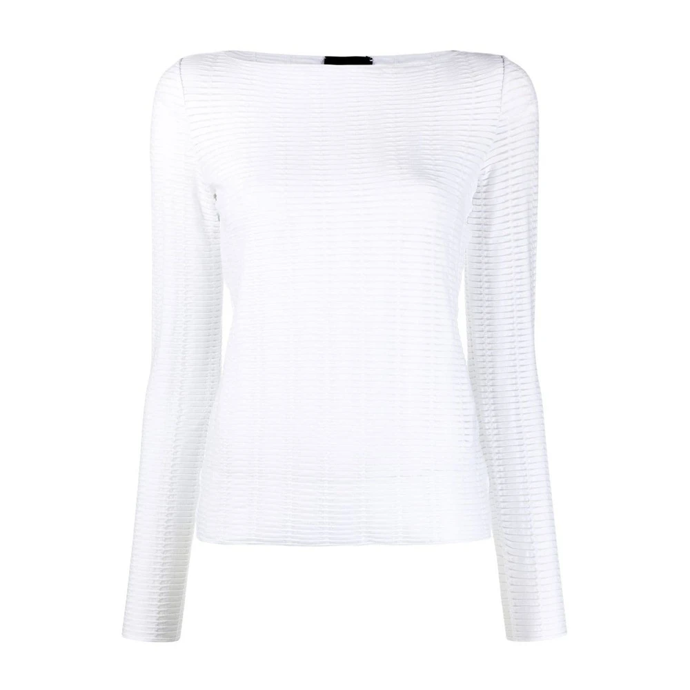 Emporio Armani Gensere White Boat-hals teksturert sammensveiset jumper fra Emporio Armani med skyhvit, strekkrekk, strukturert finish, bÄthals, lange ermer og rett hem.