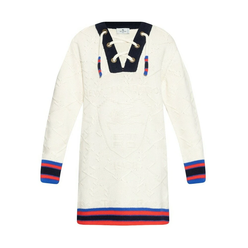 Krem løsmontering fra Etro. Denne V-hals-designen er laget av en ull- og kashmirblanding, og har dekorativ snøring, jacquard-logo-mønster og ribbestrikkede trimmer i marinen, rød og blå ved hem og mansjetter.