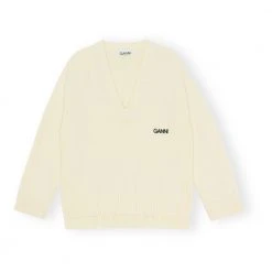 Graphic Lambswool Sweater fra Ganni. En kjempefin ullgenser med løs fasong og v-hals. Genseren har splitt i begge sidene og er noe lenger bak. Superfin til både bukser og skjørt, og perfekt utover høsten. Materiale: 80% resirkulert ull 20% polyamid