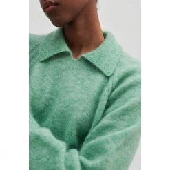 Brook knit collar fra Second Female! Strikket, supersoft ullgenser fra Second Female. Ullgenseren har raglan ermer, v-hals og krage. Ribbestrikket mansjetter. Kvalitet: 34% mohair, 34 %wool, 27%polyamide og 5%elastan Vaskes i maskin på kaldvask med lav sentrifuge. ikke bruk skyllemiddel eller tørketrommel. 56127 laurel green