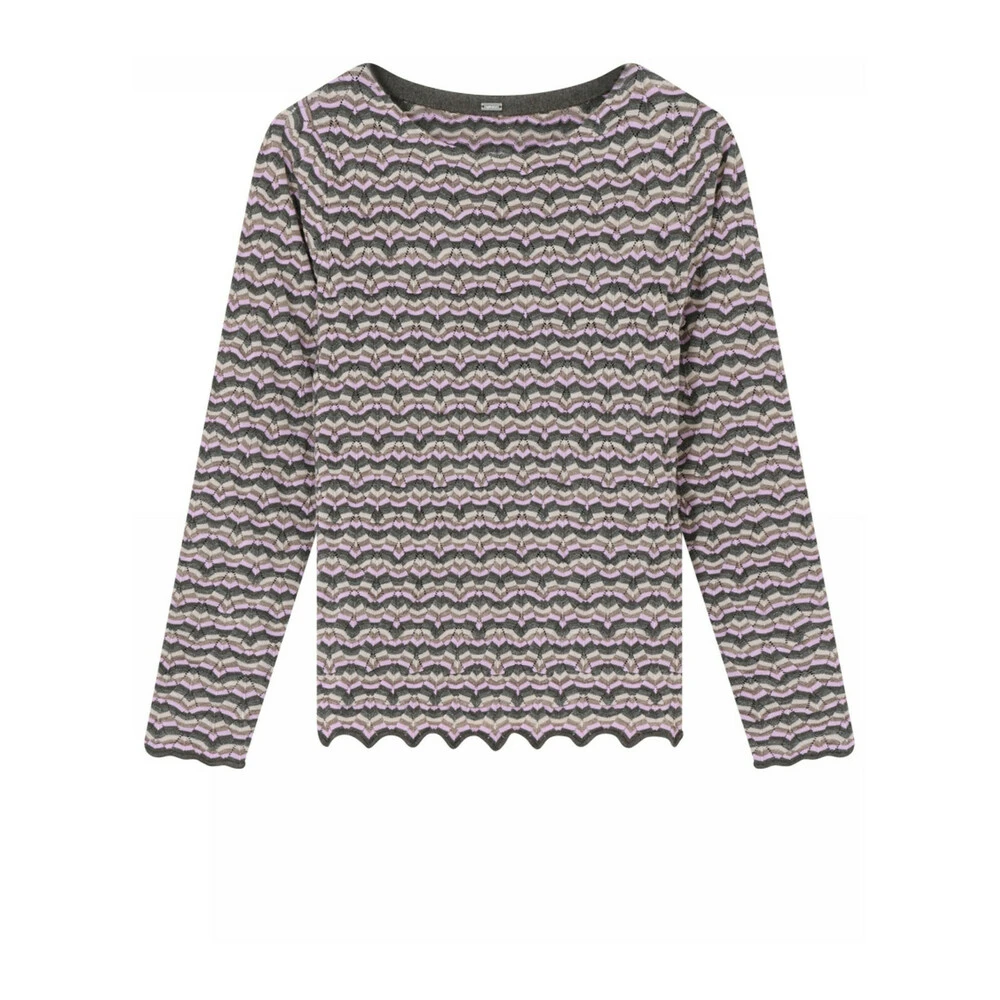Smart strikk fra Gustav med lange ermer, rund nakke, et fint mønster i vakre farger og en fin kant i bunnen. · Fit: ALM · Modell: Tallin, båthalsstrikket strikk 46413/3723 Animal Fur · Kvalitet: 45% Ull, 37% bomull, 18% Lurex