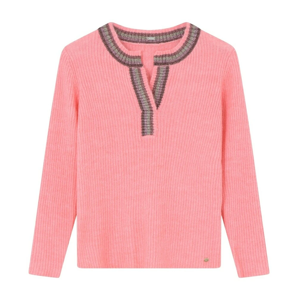 Deilig strikk fra Gustav med lange ermer, rund hals med et lite V-kutt, et fint strikkemønster og vakre glimmerdetaljer rundt halsen. · Fit: ALM · Dimensjoner: Str. XS: Brystdimensjoner: 40 cm. x 2. Lengde: 58 cm. · Modell: Aja, Rib Knit Knit 47401/3713 Coral Lily · Kvalitet: 33% polyester, 24% akryl, 20% ull, 20% mohair, 3% Elasthan · Vask: 30 grader ekstra skåne vask