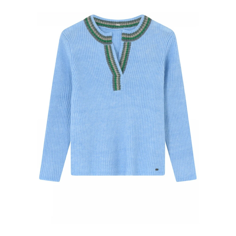 Deilig strikk fra Gustav med lange ermer, rund hals med et lite V-kutt, et fint strikkemønster og vakre glimmerdetaljer rundt halsen. · Fit: ALM · Dimensjoner: Str. XS: Brystdimensjoner: 40 cm. x 2. Lengde: 58 cm. · Modell: AJA, Rib Knit Knit Knit 47401/3713 september Sky · Kvalitet: 33% polyester, 24% akryl, 20% ull, 20% mohair, 3% Elasthan · Vask: 30 grader ekstra reserve vask
