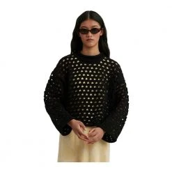 Produktbeskrivelse strikket genser organisk bomull og nylon avslappet passform heklet strikkede åpninger Hilde strikket genser er en svart genser laget av en blanding av organisk bomull og nylon og designet med en avslappet passform. Den kommer med en høy rund nakke med rullende kanter og lange brede ermer. Kroppen og ermene har heklet strikkede åpninger. Sammensetning: 80% organisk bomull, 20% nylon
