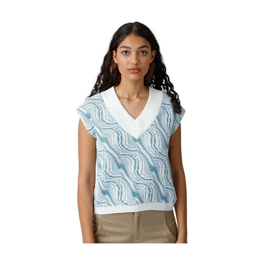 "Davina" vest fra Iis of Norway, i bl� og hvit. Vakker vest i flott kvalitet best�ende av en blanding av blant annet BCI bomull og �kologisk lin. M�nsteret er inspirert av bevegelse i vann. Modellen p� bildene er 175 cm h�y og har p� seg vesten�i st�rrelse small.