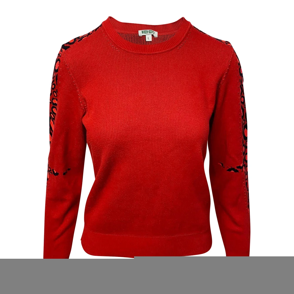 En leken trykt genser av Kenzo som har en rund utringning og leopardtrykk på ermet og på baksiden. Dette kan være din neste go-to casual eller salongantrekk. Du kan style det med et godt par jeans og noen joggesko for et uanstrengt antrekk på dagen. Kenzo Leopard Print Sweater i rød bomullsfarge: Rødt materiale: Bomullstilstand: Utmerket, uten synlige tegn på slitestørrelse: XL/IT46/US10/FR42 Tegn på slitasje: Ingen SKU: 91613 Dimensjoner: Lengde: 570 mm