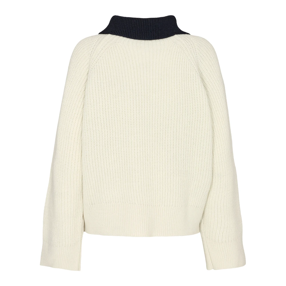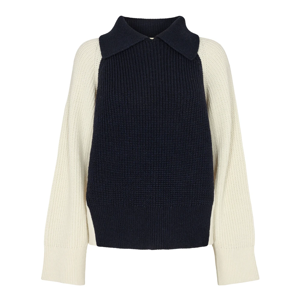 Superfin med mÞrkeblÄ front og kremfarget rygg, side og armer, samt trendy kombinasjon av strikketeknikker.