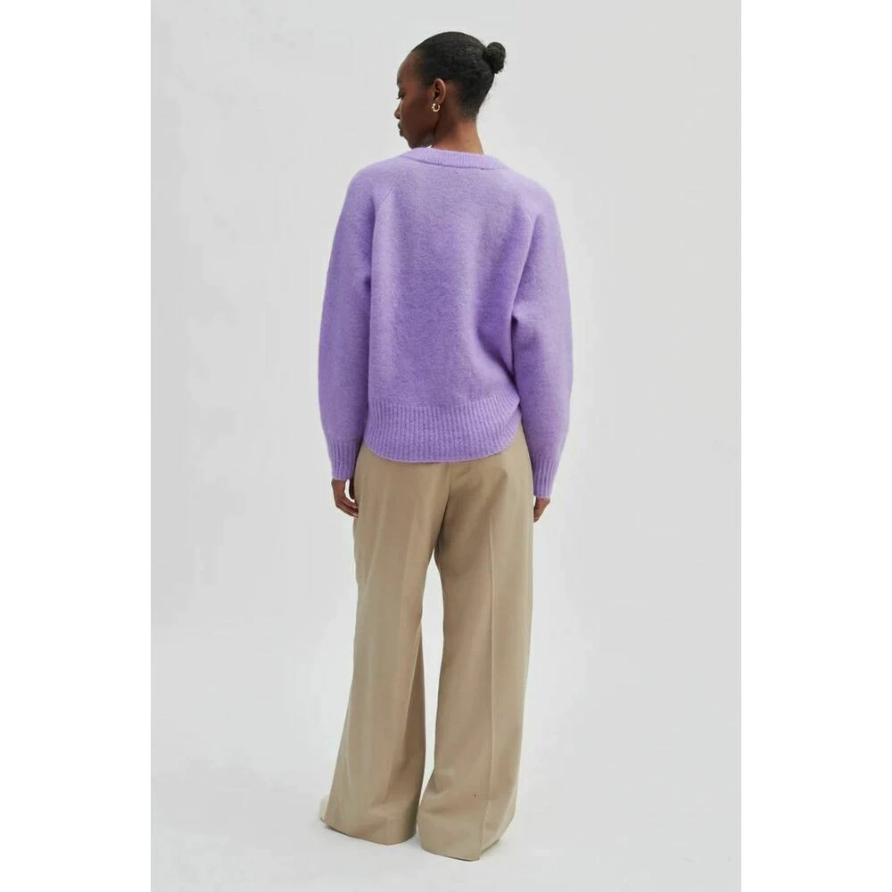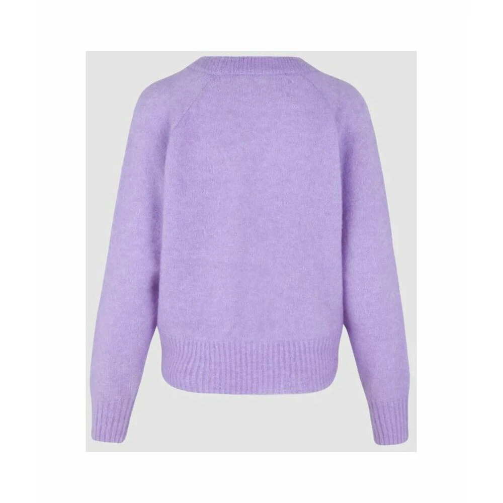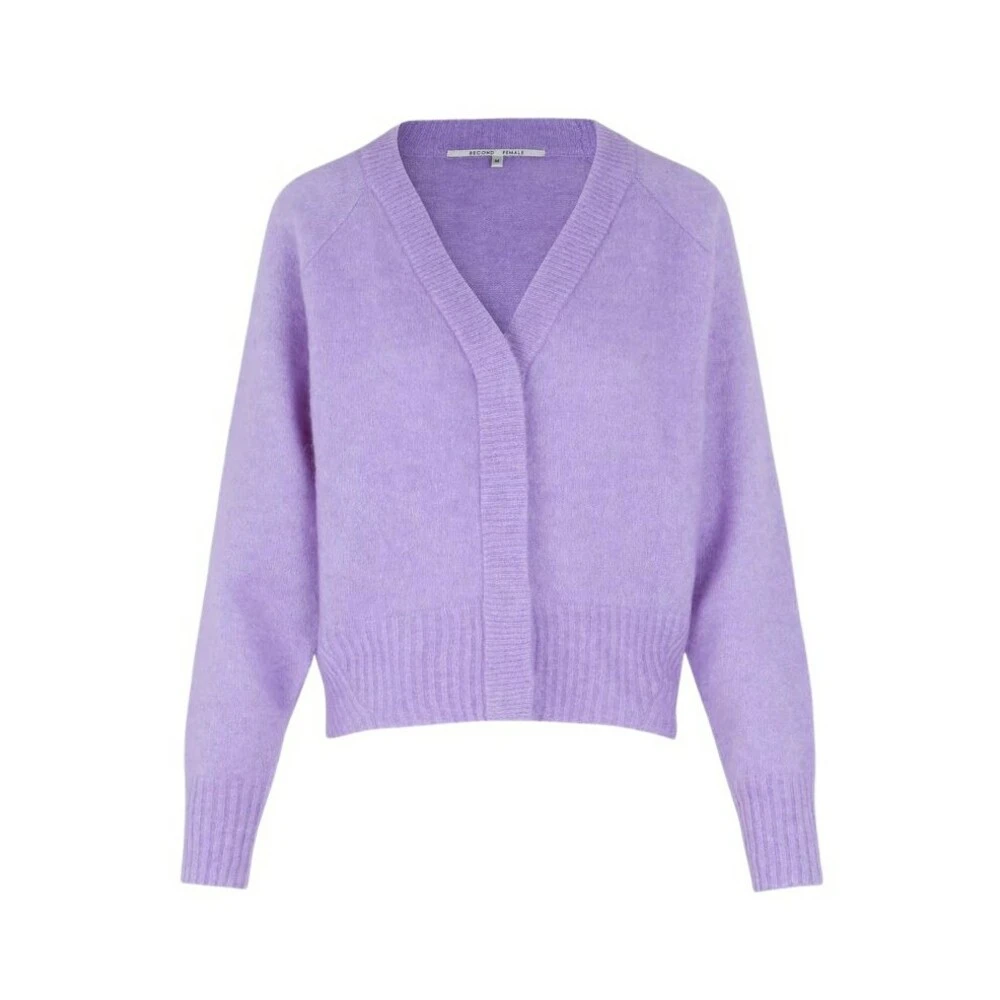 Navn : Second Female Brook Knit Boxy Cardigan Farge : Lilla/ Fairy Wren Beskrivelse: Cardigan laget i en myk og elastisk mohair-ullblanding med lett luftig tekstur. Med V-hals og skjult trykkknapp. Raglanermer med ribbestrikkede mansjetter. Ribbekant i halsen, stolpen og nederst. Løs, slap passform. Materiale : 34 % mohair, 34% ull, 27% polyamid, 5 % elastan
