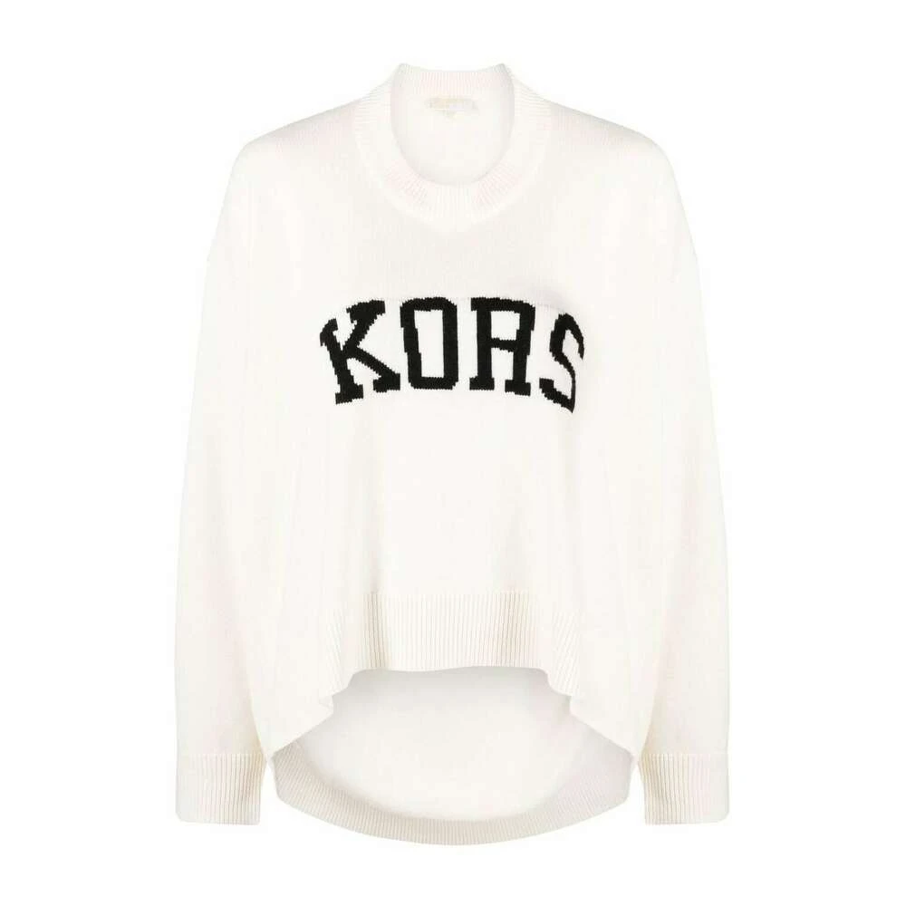 Krem store genser fra Michael Michael Kors. Dette designet er laget av en merinoullblanding, og har en svart logo -broderi, rund hals, ribbet hem og lange ermer med lave skuldre.