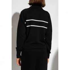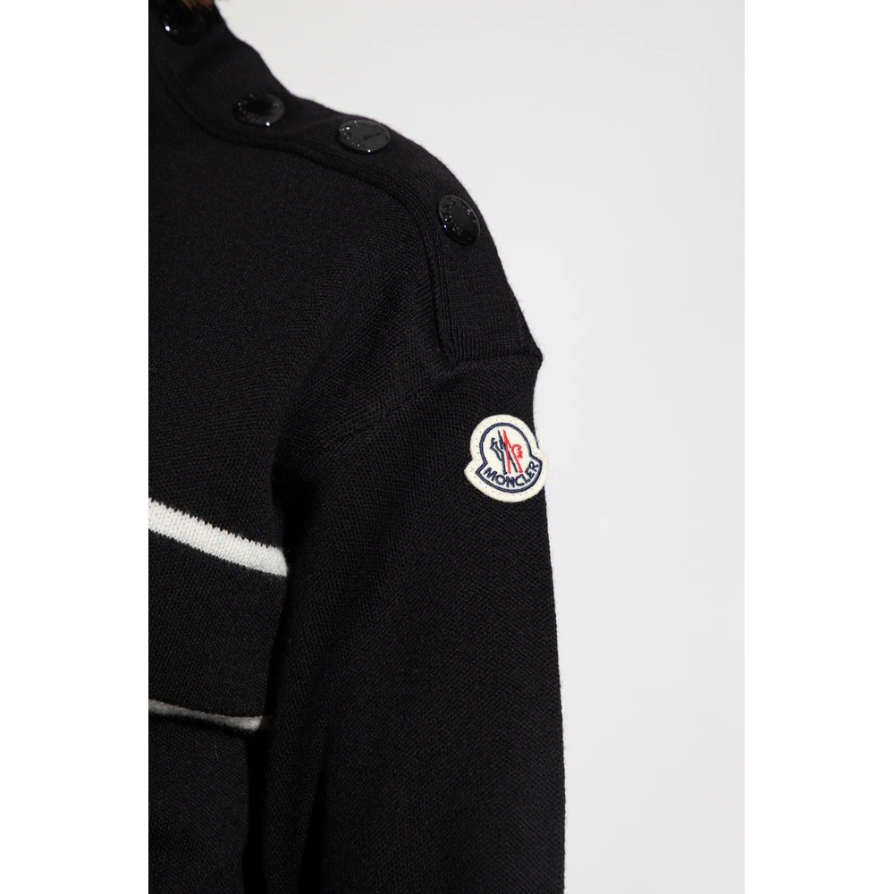 Svart og hvit genser fra Moncler. Denne designen er laget av ull, og har en logo-broderi, smeltet stativkrage, følte lapp på skulderen og ribbestrikkede trimmer ved hemmen og mansjettene.