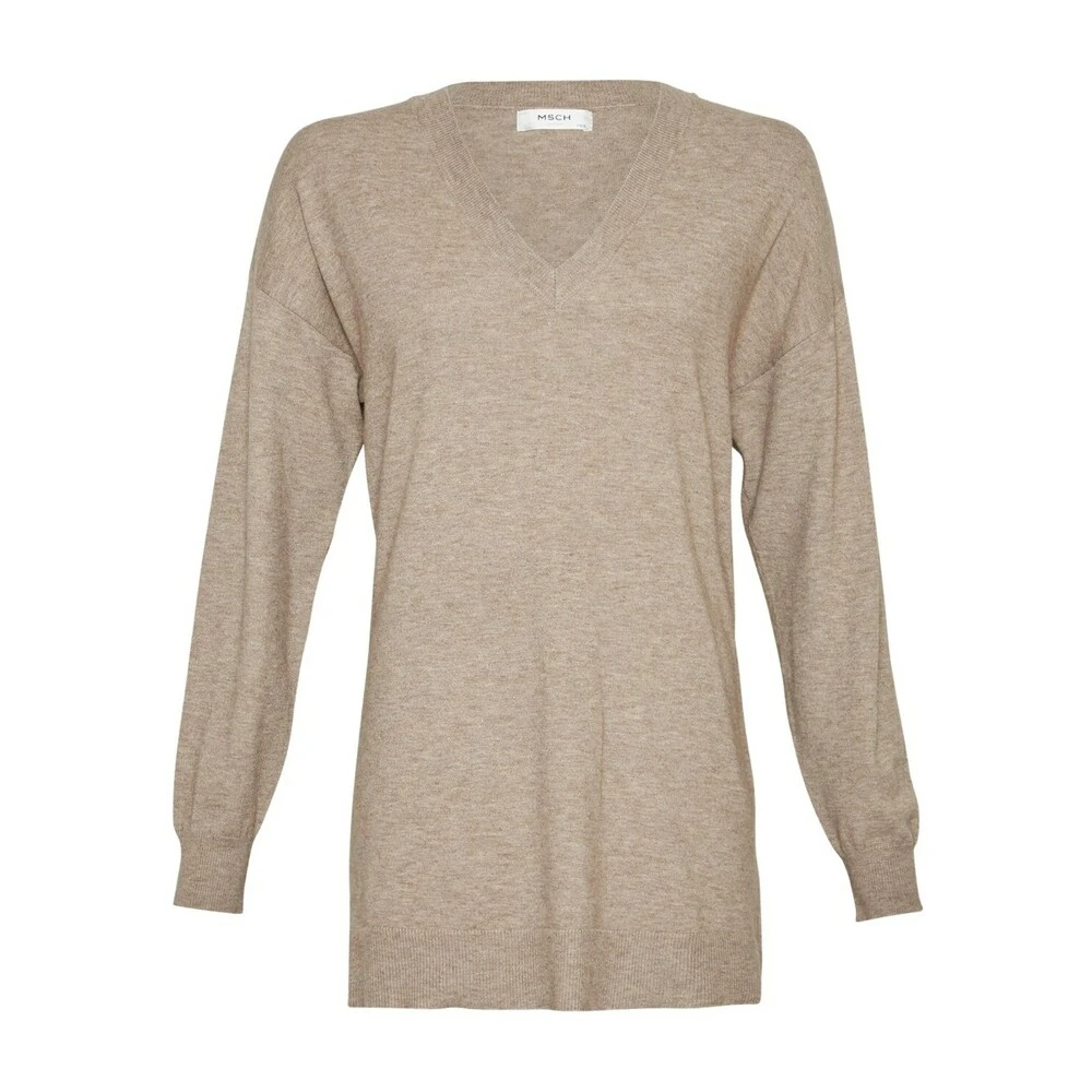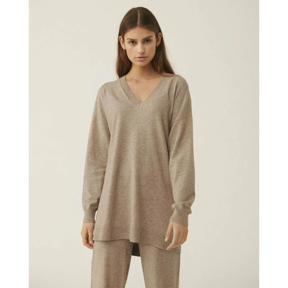Løs V-hals genser – dyp v-hals – Drop pÃ¥ skulderen – ribben strikket lange mansjetter og kant – Middels lengde Sammensetning: Om Lenzing Ecovero Viskose – Laget av tre høstet fra ansvarlige kilder der nye trær er plantet med samme hastighet, og hvor arbeidstakerrettigheter er prioritert. – produsert i et lukket kretssystem, hvor det er mulig Ã¥ gjenbruke nesten 100% av kjemikaliene, sÃ¥ vel som vann – Ecovero er sertifisert med EU-miljøet som i trÃ¥d med høye miljøstandarder i hele deres livssyklus: fra utvinning av RÃ¥varer til produksjon, distribusjon og avhending.