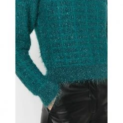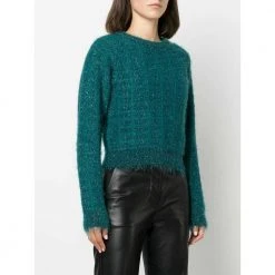 Pinko-gensere skimmer strukturert genser fra Pinko med tealblĂĄ, alpakka ullblanding, skimmer finish, strukturert finish, frynsete detaljer, rund nakke og lange ermer.