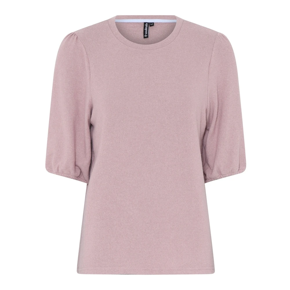 Tynn Genser fra Soulmate i fargen Gammel/Pudderrosa. Den har rund hals, kort litt vid arm m/strikk. Lengde i st. M: 59cm. Innhold: 68% Viskose 29% Polyester 3% Elastan Vask: 30*
