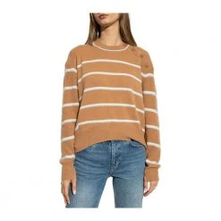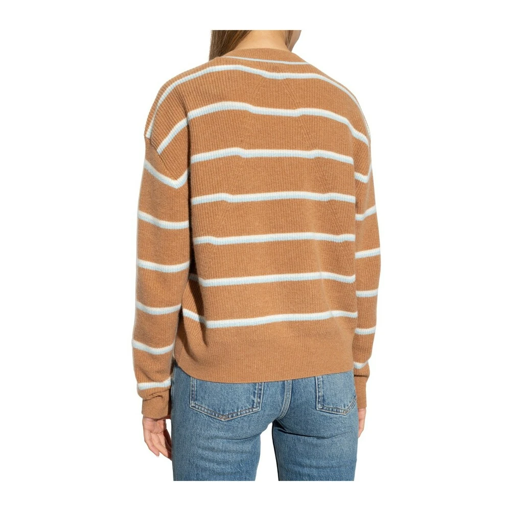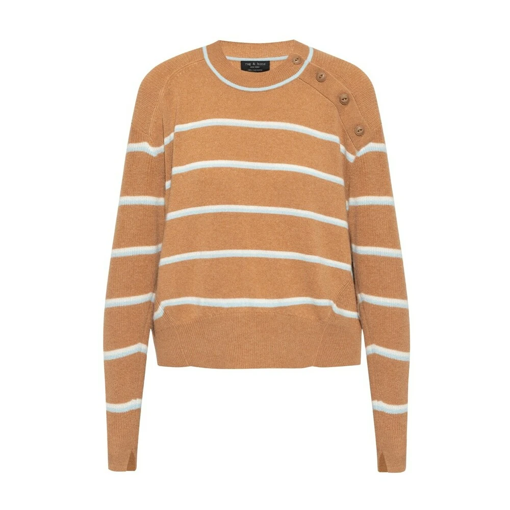 Brun crewneck -genser fra Rag & Bone. Denne stilen er laget av kashmir, og har et hvitt og blå stripe -mønster, lange ermer og knapper på knappen på skulderen.