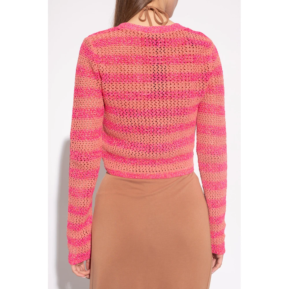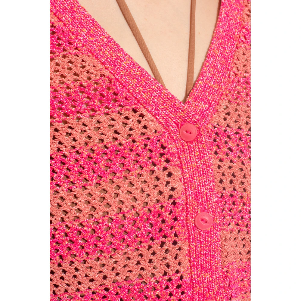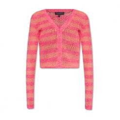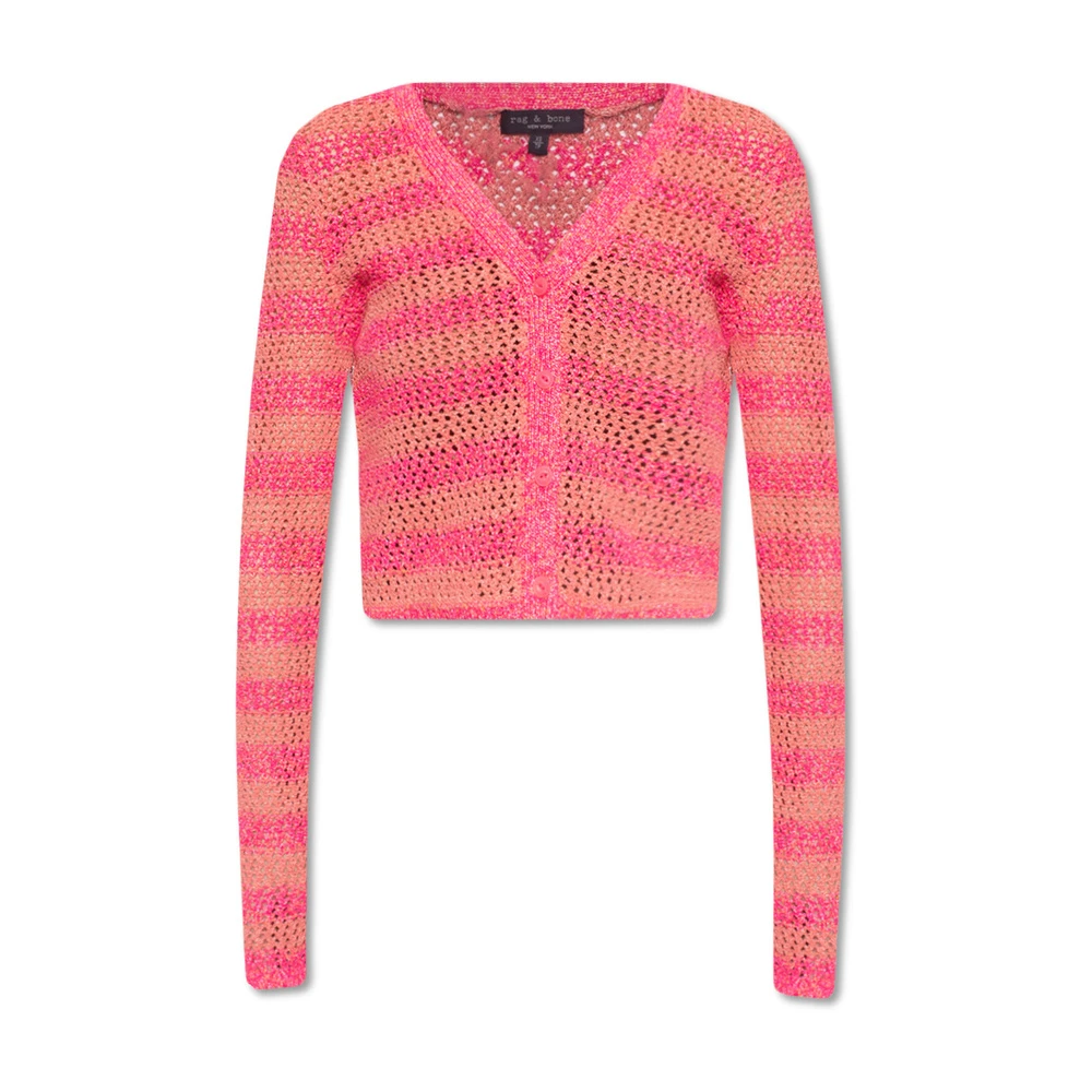 Rosa cardigan fra fille og bein. Dette plagget er strikket fra bomull og resirkulert stoff, og har knippfestene, stripemĂžnsteret og ribbestrikket og mansjettene.
