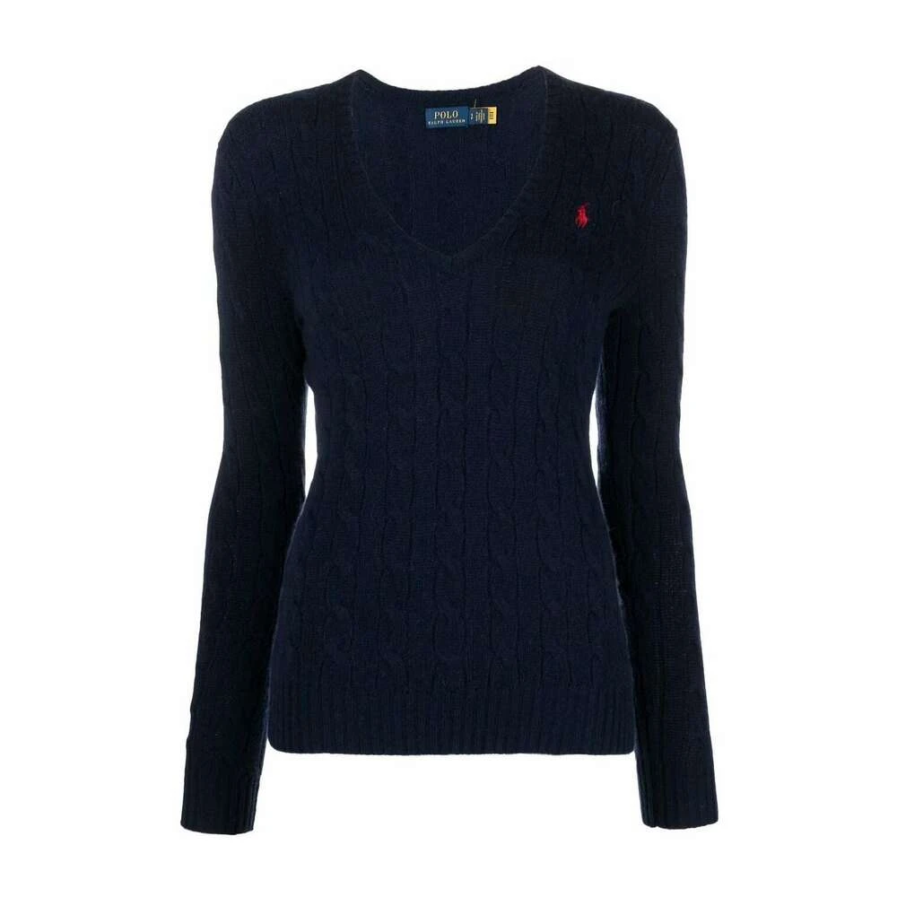 Ralph Lauren Gensere Blue Kimberly Polo Pony Cable-Knit Jumper fra Polo Ralph Lauren med blĂĄ, ull-kashmere blanding, kabelstrikk, signatur polo ponnimotiv, V-hals, lange ermer, ribbet mansjetter og ribbet hem.