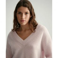 Navn: GANT Wool rib v-neck Farge : Rosa/ Silver peony Beskrivelse : Denne genseren med V-hals er strikket i en myk ullblanding og har et elegant, tidløst utseende. Kutt i en avslappet, vid passform som gjør det enkelt å legge på lag, gjør dette plaggets uanstrengte fasong godt egnet til å ha på seg halvt gjemt inn i en skarp bukse, eller mer uformelt med denim. Materiale: Lammeull 80%, Polyamid 20%