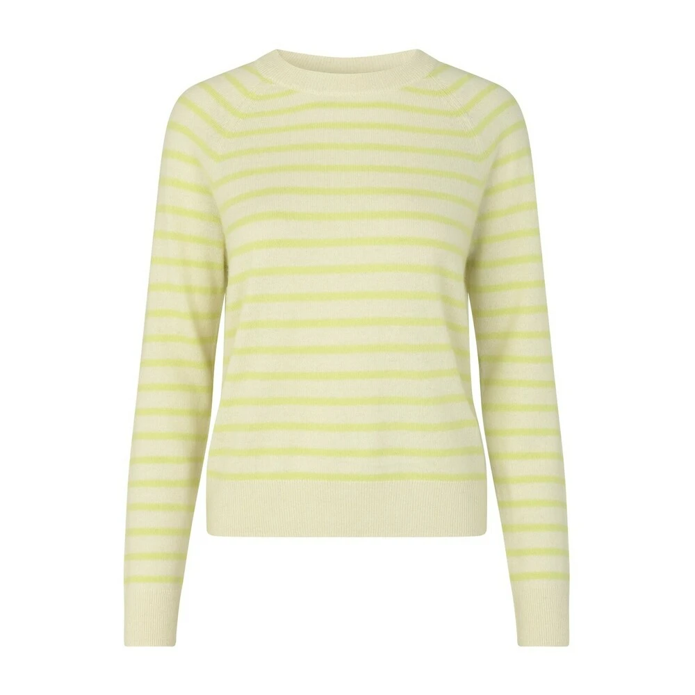 Dette er en strikket genser fra Samsøe Samsøe i kremfarget med neongrønne striper. Den er laget av 100% kashmir.
