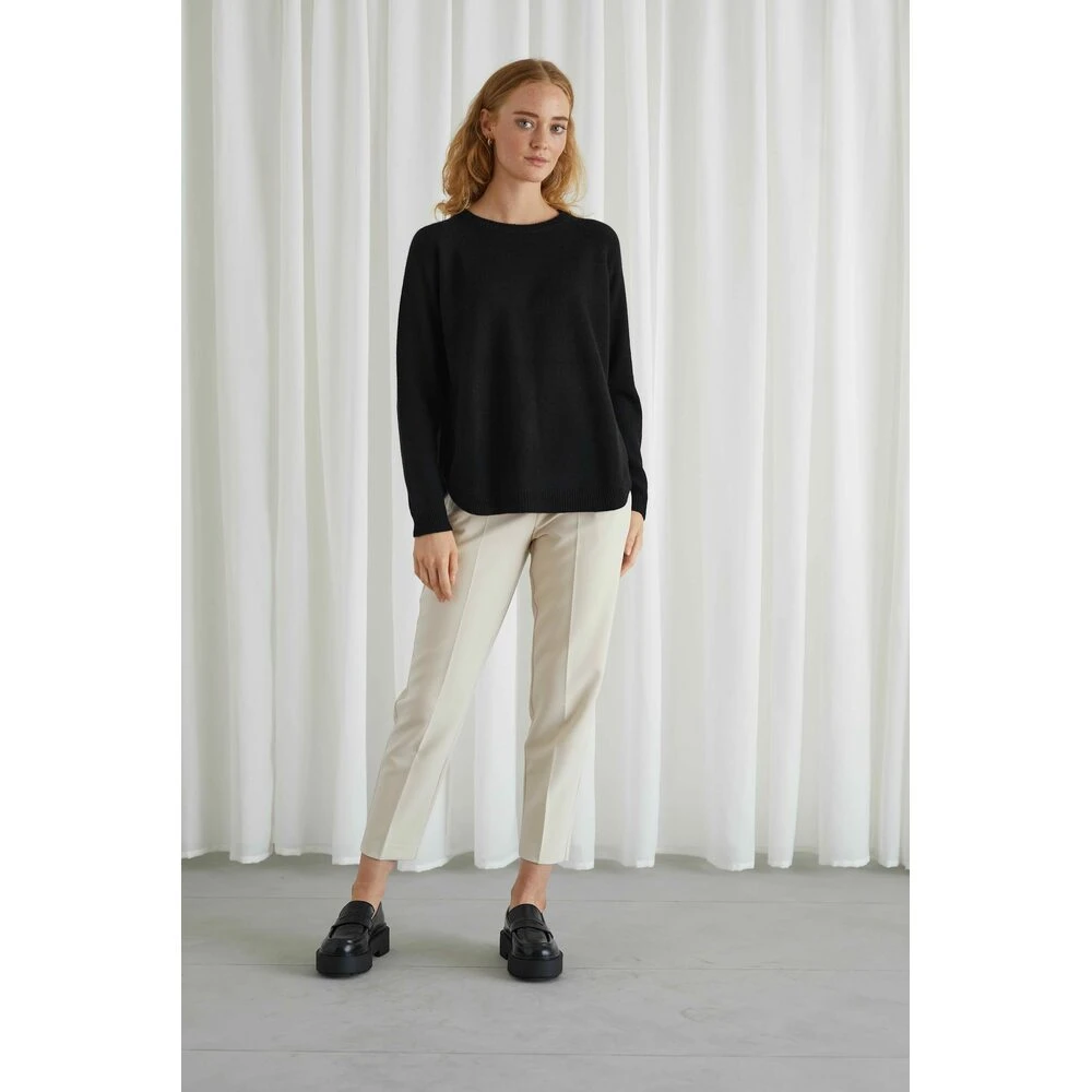 Navn: Davida Raglan Curved Sweater Farge: Sort Beskrivelse: Rundhalset genser med fullengdes raglanermer. Avrundet nederkant med dekorative ribbedetaljer. Rett i sidene. Materiale: 100 % kasjmir Normal i størrelsen Rett passform Genseren er 62 cm lang i størrelse S