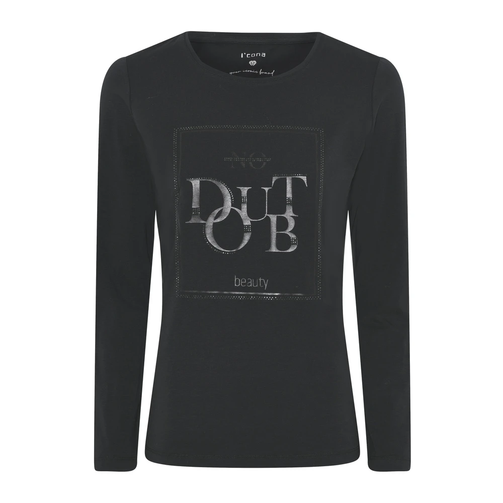 Topp fra I`cona i sort med glitrene sorte stener i motiv pÄ brystet. Toppen er i T-skjortemodell med rund hals og lange ermer. Dette er en lekker topp i myk bomull som bÄde kan brukes nÄr man pynter seg og som T-skjorte til bukser. Normal i stÞrrelsen. Innhold: 94% Bomull, 6% Elastane. Vask: HÄndvask
