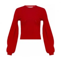 Rød ribbet crewneck -genser fra Stella McCartney. Denne designen har lange puffhylser og ribbestrikk i mannskapshalsen og mansjettene.