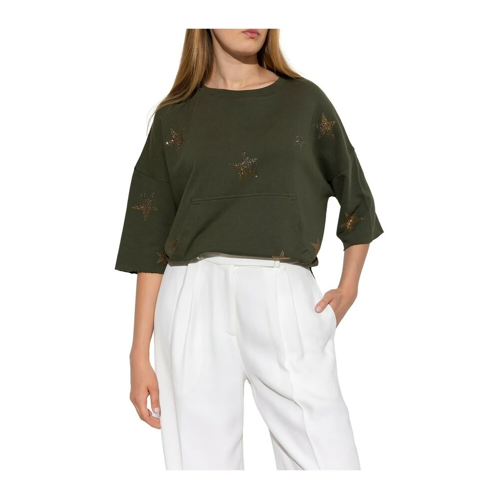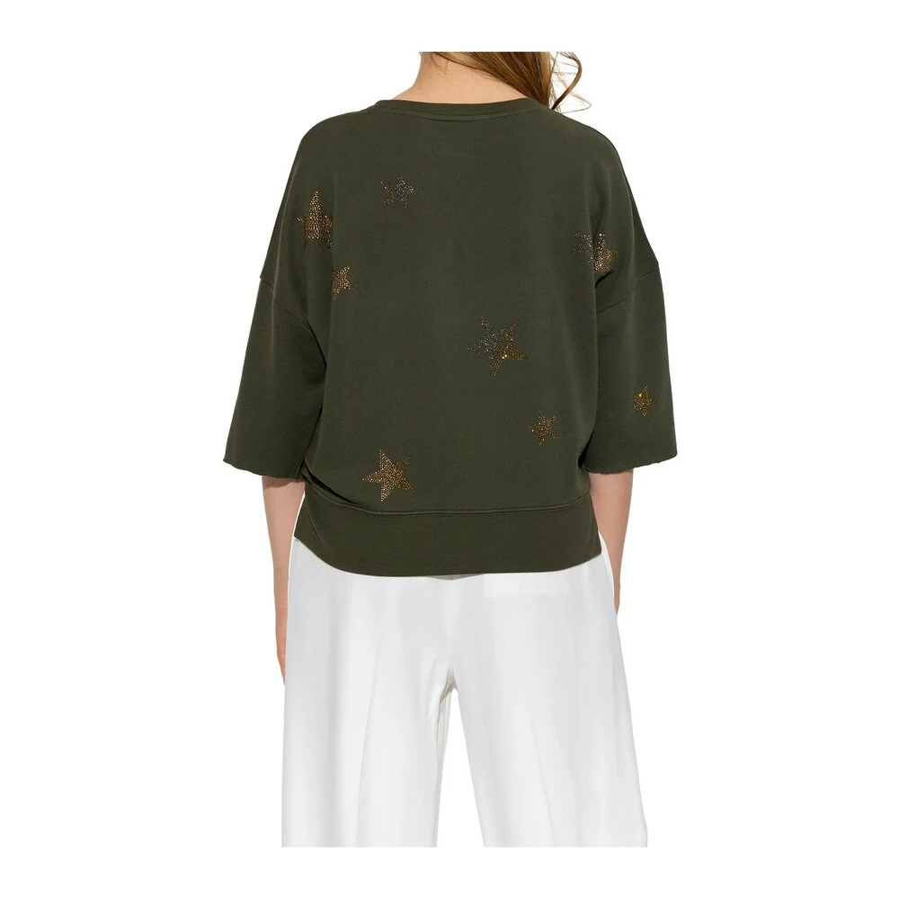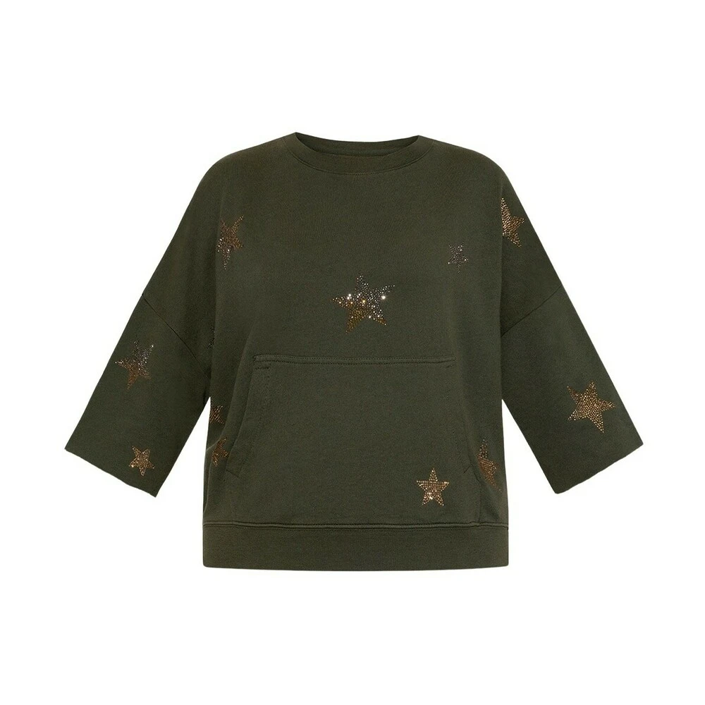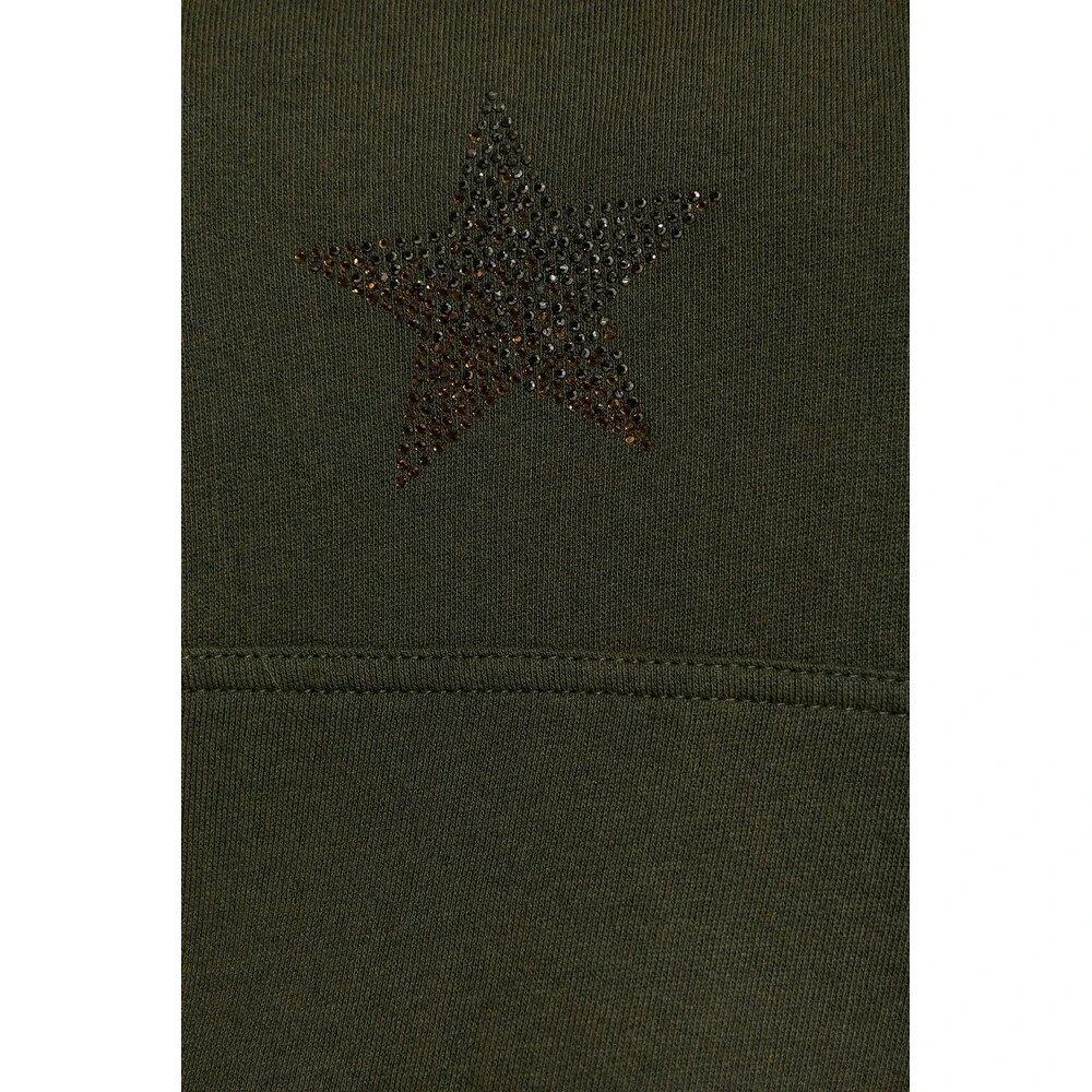 Mørkegrønn ‘Kaly’ CrewNeck Sweatshirt fra Zadig & Voltaire. Denne stilen er laget delvis fra organisk bomull, og har en avslappet silhuett, blank gullfarget stjerneapplikasjoner, en glidelomme foran, korte brede ermer med rå hems og ribbestrikk på kragen og bunnen.